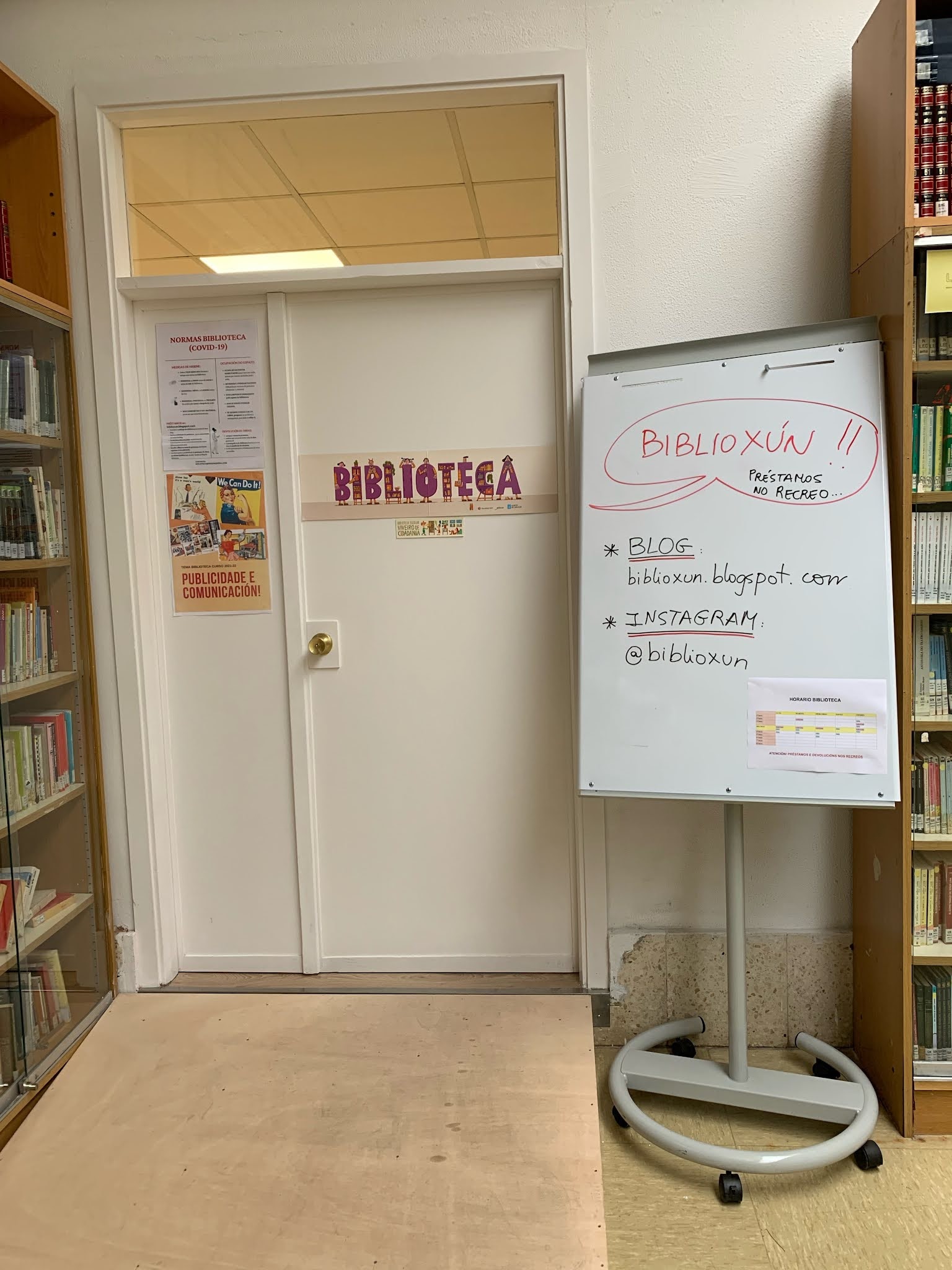 Na entrada da Biblioxún está a nosa pizarra magnética, onde está o horario e outra información importante. |