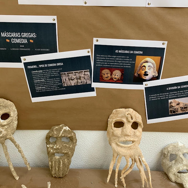 O Departamento de Grego (profesora Loli Cruz), o Departamento de Plástica (profesor Eusebio) e o alumnado de 3º de ESO organizaron esta exposición de MÁSCARAS DO TEATRO GRECOLATINO e unha serie de TRABALLOS DE INVESTIGACIÓN sobre o tema.