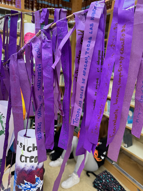 Na Biblioteca, como estes últimos anos, o Rumoroso énchese de mensaxes que a rapazada escribe nas fitas de papel de seda de cor morada. Da gusto velos!